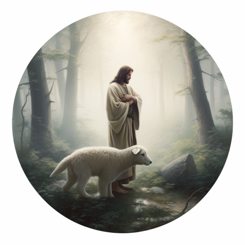 A circular, realistic, cinematic illustration featuring Jesus as the Good Shepherd holding or gently reaching out to a small lamb in a peaceful forest setting. Jesus is dressed in flowing robes, with a compassionate and caring expression. The lamb looks up at Him with trust and innocence. The atmosphere is misty, with soft, diffused light filtering through tall trees, creating a serene and hopeful mood. Include the text 'The Good Shepherd is on the way' subtly in an elegant, serif font around the top curve of the circle. --ar 1:1 --v 5.0
