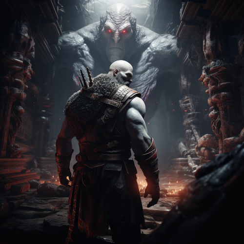 Kratos from god of war 2018 , in an abandon space station with smoky pipes, and a giant monster behind him with glowing eyes in the dark, Kratos looking the camera, full body, the manster crawling in the background wall --s 250
