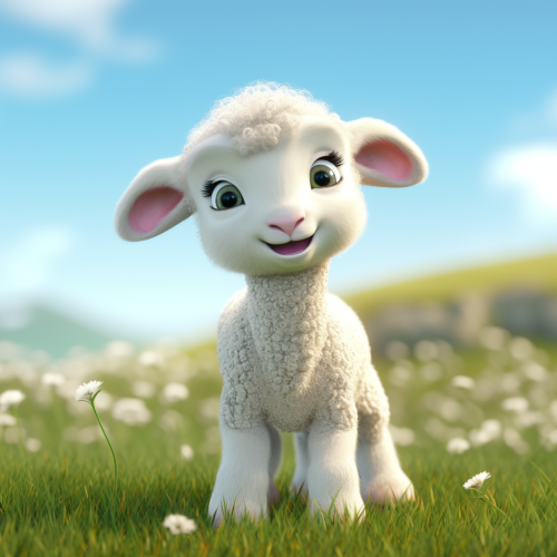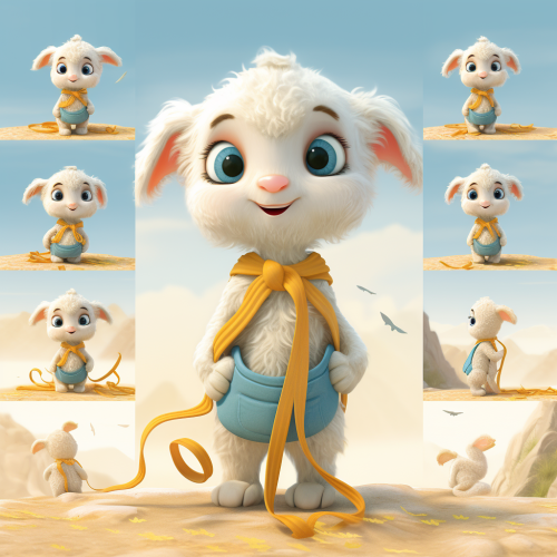 little lamb character, multiple poses and expressions, children's book illustration style, simple, cute, full color, glowing white wool, tiny golden bell around neck with a blue ribbon, expressive large eyes, soft and inviting textures, serene meadows and soft skies in the background, --no outline