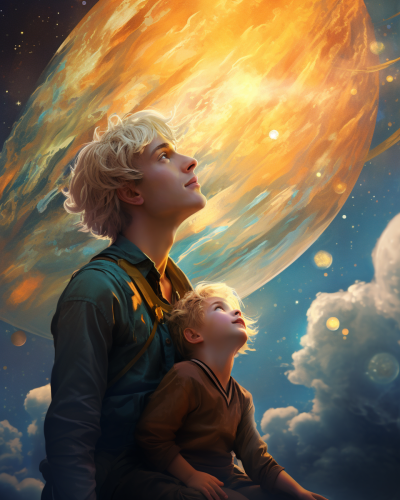 Create a whimsical and mystical style, blending futuristic elements with a sense of playful wonder and cuteness. The visuals should feel like they’re pulled from a dream, with glowing colors and soft gradients. Characters are adorably designed, with exaggerated expressions and charming details. The environments are ethereal, blending fantasy and cosmic elements--filled with floating islands, stars, and glowing creatures. Use smooth, flowing lines and soft lighting, with radiant, magical glows around objects. The aesthetic is a mix of cosmic fantasy and sci-fi, with a delicate balance of light and shadow. Everything feels lighthearted yet epic, like a magical universe where innocence and adventure coexist. Luna and Sol stand on their floating island once again, holding the Heart of Truth. The universe around them is glowing and vibrant, with stars twinkling brightly and galaxies swirling with color. The once-darkened cosmos is now filled with light, and distant planets, comets, and constellations are shining. The children look peaceful and proud, knowing they’ve restored balance to the universe.