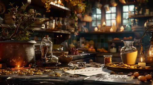 A fantasy kitchen, plant pots, scattered gold coins, various potions on shelves, fantasy ingredients, a letter with 'Heenee' written on it, cinematic, dramatic lighting --ar 16:9 --v 6.0