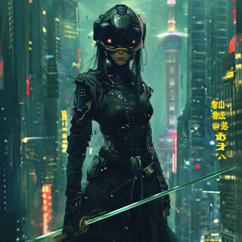 Cyber tech wear, beautiful girls, tech wear, giant technology headgear. Girl, giant samurai sword, concept art, full body, looking at camera. Scary atmosphere, another world, future ninja,--ar 3:4 --v 6.0