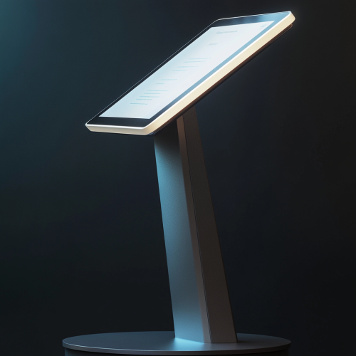 A sleek, modern iPad-like kiosk mounted on a minimalist pedestal, side view, clean and elegant design, touchscreen interface visible, soft lighting, displayed on a dark background --s 50 --style raw