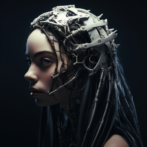 Billie Eilish as a mystical robot made with human skeleton dark and creepy