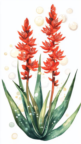 illustration of red orlean with aloe vera, propolis and bubbles in the style of italianate flair, organic designs, aquarellist, decorative borders, classicist, bloomcore, white background --ar 9:16