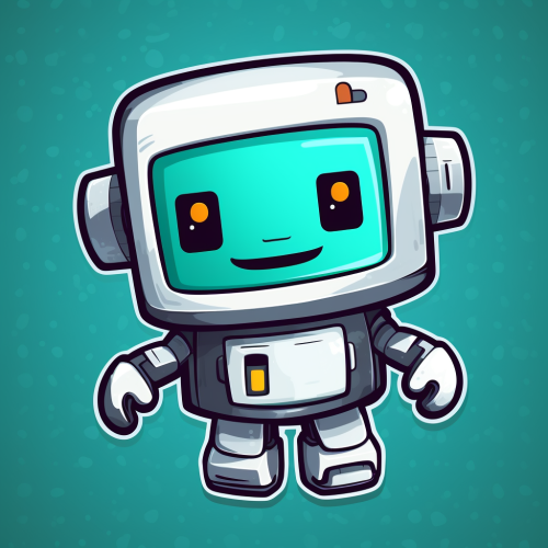 cute robot character with silver and teal coloring, the robot is floating without legs, and has a screen with pixel art for a face that is looking happy, vector sticker design with white outline