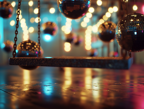a straight on view of an empty hanging swing in the middle of a room full of disco balls, realistic, minimal, 8k, tilt shift--stylize 50 --v 6.0 --ar 4:3