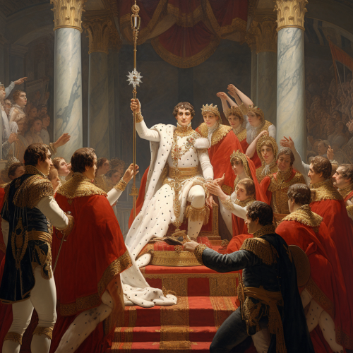 French rugby player Antoine Dupont is crowned by Anthony Jelonch in the manner of the painting 'The Coronation of Napoleon' by Jacques-Louis David." Background: The background of the image should resemble the grandeur and style of Jacques-Louis David's painting "The Coronation of Napoleon." This could include an ornate setting, grand architecture, or an opulent throne-like seat for Antoine Dupont. Antoine Dupont: Antoine Dupont should be portrayed wearing a French rugby team jersey, and his face should be recognizable. He should be positioned in a central and prominent role in the image, similar to how Napoleon is depicted in the original painting. Anthony Jelonch: Anthony Jelonch should also be portrayed in his French rugby team jersey, and his face should be recognizable. He should be shown in a manner that suggests he is crowning Antoine Dupont, just as Napoleon was crowned in the original painting. This could involve him holding a symbolic rugby ball or adopting a pose that mirrors the original painting. Composition: Pay close attention to the composition of the image, ensuring that it captures the essence of the original artwork while incorporating the rugby theme. Details: Add any necessary details to make the image more rugby-themed, such as rugby-related symbols, equipment, or French team insignia. To bring this concept to life, it's recommended to work with a professional artist or designer who can use digital art tools to create the image. They can ensure that the likenesses of Antoine Dupont and Anthony Jelonch are accurate and recognizable.