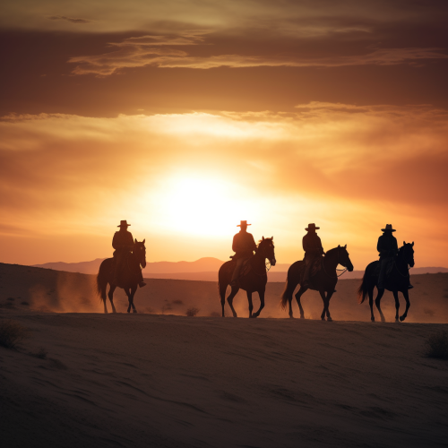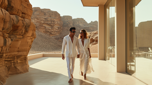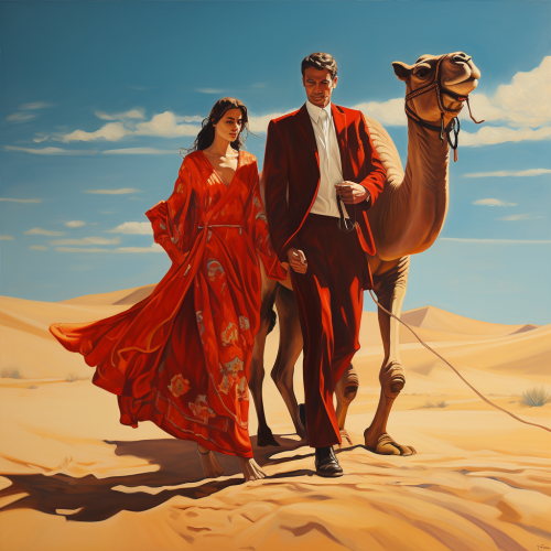 a romantic and adventurous scene featuring a man in a tailored suit and a woman in a striking red dress riding camels through the vast and serene desert. Envision the golden hues of the sand dunes stretching into the distance, with a clear blue sky overhead. Capture the details of the man's well-fitted suit and the woman's flowing red dress as they enjoy the camel ride. Emphasize the elegance and contrast of their attire against the desert backdrop, and showcase the unique connection between the couple and the camels. Utilize the warm desert sunlight to create a visually stunning and immersive scene, casting long shadows across the sand. Enhance the image with subtle details like the camel's expressive eyes and the undulating patterns of the dunes. This scene should evoke a sense of romance, adventure, and timeless style, combining the sophistication of formal attire with the rugged beauty of the desert landscape.
