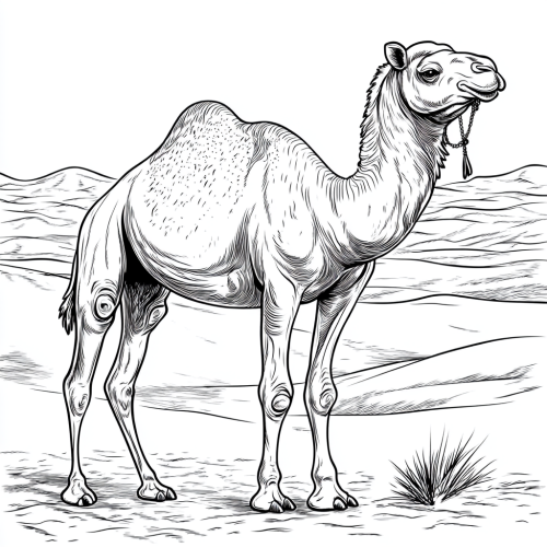 Camel in the Sahara desert with sand dunes, thick monoline outline, fully closed shapes, pure white background, no gaps in the lines. no color, for chidrens coloring book --s 250