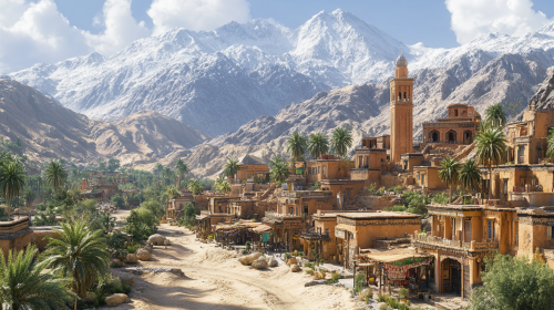Photorealistic. 8K. Create the diverse landscapes and culture of Xinjiang providence. Include the Taklamakan Desert’s vast dunes and Kashgar’s bustling bazaar. framed by Tianshan Mountains, Uyghur architecture. warm earthy tones. --s 500 --ar 16:9
