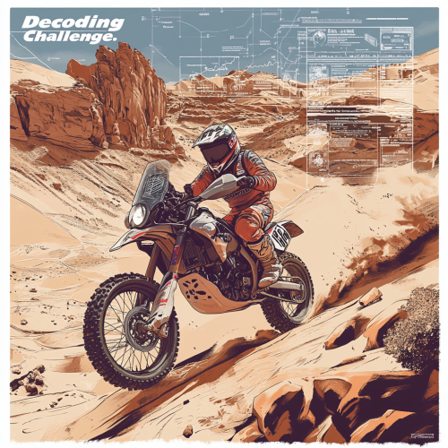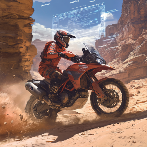reate an illustration that captures the essence of the "Decoding Dakar Challenge." The scene should depict a thrilling rally environment with a motorcycle rider navigating through rugged desert terrain, surrounded by towering dunes and rocky outcrops. In the background, include subtle hints of a digital interface overlay, showcasing predictive analytics and GPS maps, symbolizing the challenge's interactive and predictive nature. The rider should be mid-action, exuding determination and focus, with the Dakar logo subtly incorporated into the design. The overall atmosphere should be intense and adventurous, reflecting the spirit of the Dakar Rally.