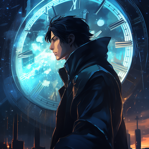 A man with dark hair, wearing a black cloak looking down at a time stream, inspired by the timeline from the show "loki." Make the timestream light blue with colors on the inside, Anime, character design, cinematic, HD, 8K