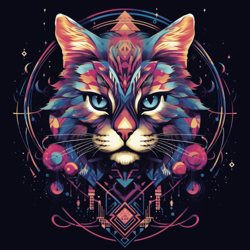 Gato Debochado::2 Mosaico, Vetorização, Matiz, Simbolismo, Abstracionismo, Synthwave:: camiseta em vetor, design gráfico de composição central, fundo simples::2 maquete::-2