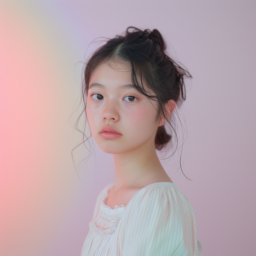 A Japanese teenage girl posing in a studio with a simple and serious style. She wears a clean and modest outfit, with minimal makeup and delicate accessories. The studio background features soft pastel colors, creating a calm and gentle atmosphere that complements her serious expression. Her pose is composed and graceful, highlighting a sense of maturity and thoughtfulness. The lighting is soft, accentuating her natural features and the serene setting. --v 6.0