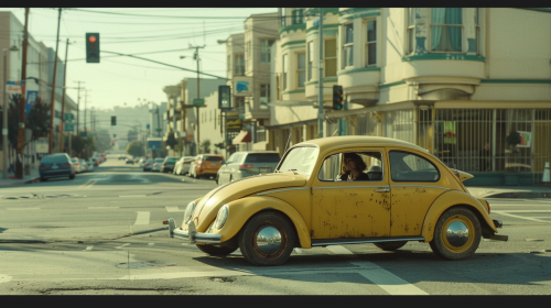 a movie scene where we see a whole vintage yellow VW bug with a frustrated teenage girl driver. the vw bug is stopped in the middle of an intersection. it is a wide shot. --ar 16:9 --style raw --v 6.0