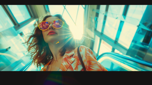 happy woman climbing escalatorr. 4k bright cinematic colors. --ar 16:9 --v 6.0