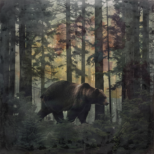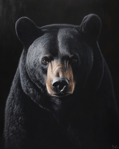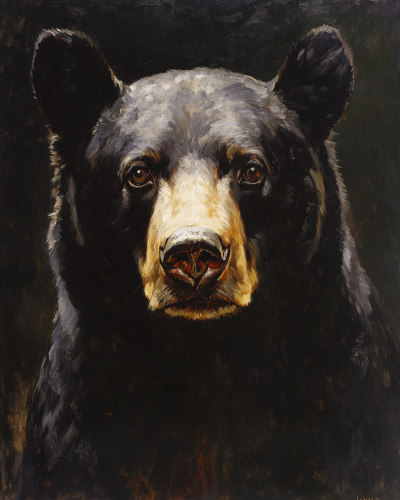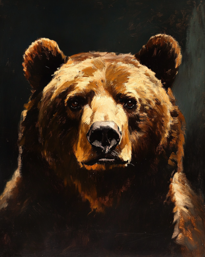 John Singer Sargent painting depicting front view our subject looks down at us, portrait of a massive bear towering over us with a strong jaw, looking serious but relaxed, very realistic image and dramatic lighting deep blacks --ar 4:5