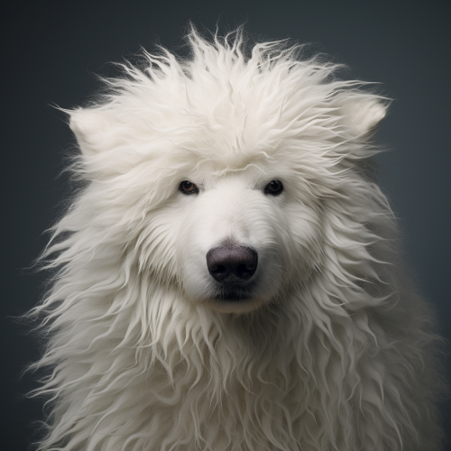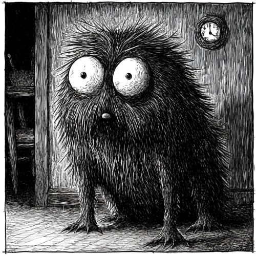 Create an eerie, whimsical illustration in the style of Edward Gorey, featuring a peculiar, plush-like dog with exaggerated, slightly unsettling features. Use intricate cross-hatching to render the fur texture in fine detail, capturing the unevenness and softness of the material. The expression should evoke an odd mixture of calmness and unease, as if frozen in an unnatural smile. Keep the background minimal, perhaps suggesting the hint of a domestic setting with only sparse elements like kitchen utensils or abstract furniture outlines in the shadows. Add subtle symbolic motifs--perhaps a small clock or a bird’s silhouette in the corner--to hint at a hidden narrative or an eerie sense of time standing still. Utilize negative space to enhance the surreal, dream-like quality, blending whimsical charm with a melancholic undertone.