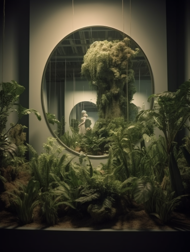 empty museum room with weird plants, a strange creature inside the mirror, low and soft lights, high detail --v 5.1 --s 750 --style raw --ar 3:4