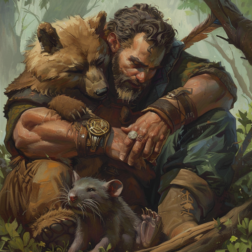 a handsome strapping dnd bugbear cuddles with a real bear and a rat