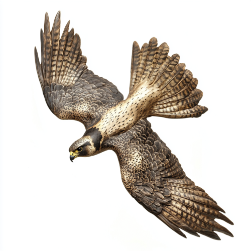 A bronze sculpture of a peregrine falcon in mid-flight, capturing its dynamic pose with detailed feathers and an intense expression, set against a simple white background
