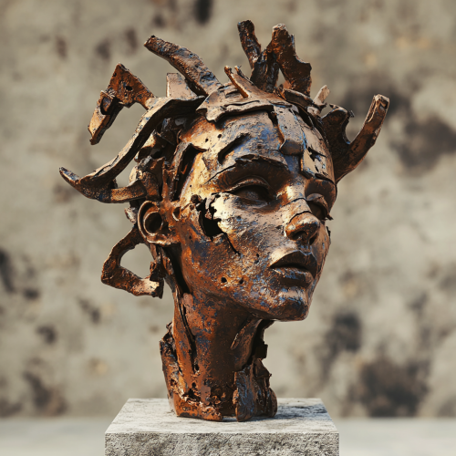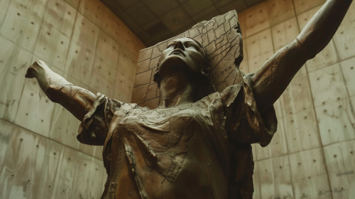 A photo of a bronze statue depicting a towering woman, standing in a slightly crouched pose, straining under the immense weight of a 3D model of the United States on her shoulders. Her head is slightly bowed, and Her arms are stretched upwards, supporting the model. --ar 16:9 --v 6.0
