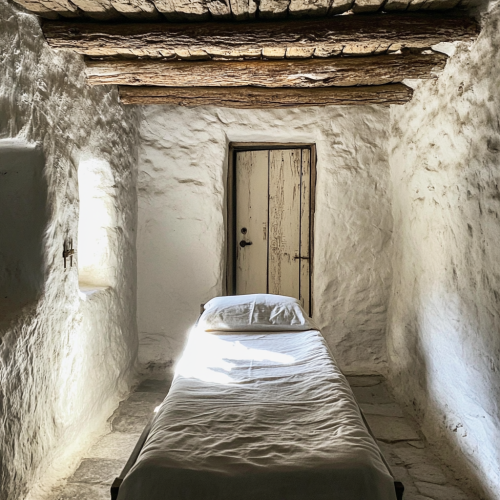 inside of a bronze age hospital room in ancient greece, white clay walls with wooden beams. closed door with no handle, looks like a location from the English Patient movie.