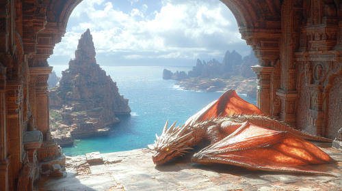 wide shot, focus on a Bronze colored Dragon with wings sleeping in the a gnomish temple, the sides of the temple are open arches, the background is the vast ocean, DnD atmosphere, 8k digital, super resolution, --s 750 --ar 16:9