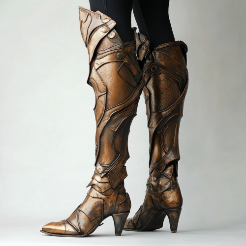 a pair of womens thigh high boots that are made of bronze armor and but keep the shape of the foots anatomy with visible armor for each individual toe