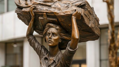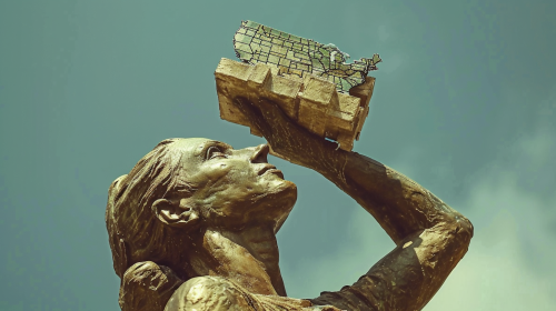 A photo of a bronze statue depicting a towering woman, standing in a slightly crouched pose, straining under the immense weight of a map of the United States on her shoulders. Her head is slightly bowed, and her arms are stretched upwards, supporting the map on her shoulders. --ar 16:9 --v 6.0