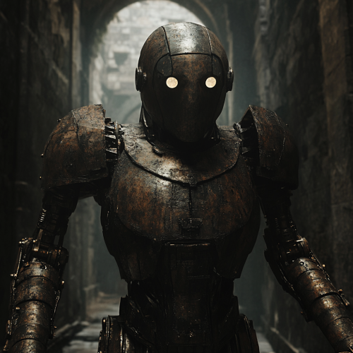 a steampunk automaton that is bronze and warrior like it is faceless and is traversing a dark corridor or an ancient ruin of a bright kingdom turned dark it is cinematic and realistic enough to be animate it is a gritty dark Fantasy beautiful vibe