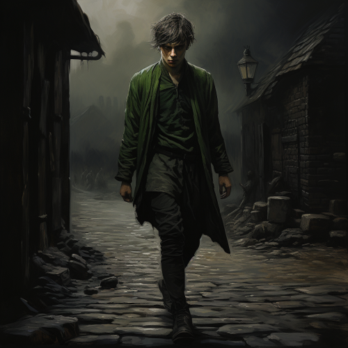 dark fantasy drawing of a short, plus-sized feminine young adult man with a round face, wearing green and walking on a lush and light-filled cobblestone path.