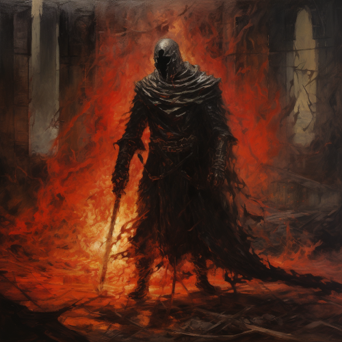 aldrich from dark souls 3 in an inferno of shadows, 1982 dark fantasy oil panting