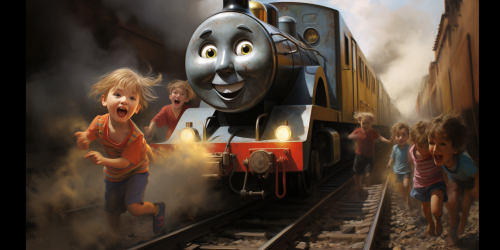 insane Thomas the train, sneaking up on unsuspecting children, digital art --ar 18:9 --v 5.2