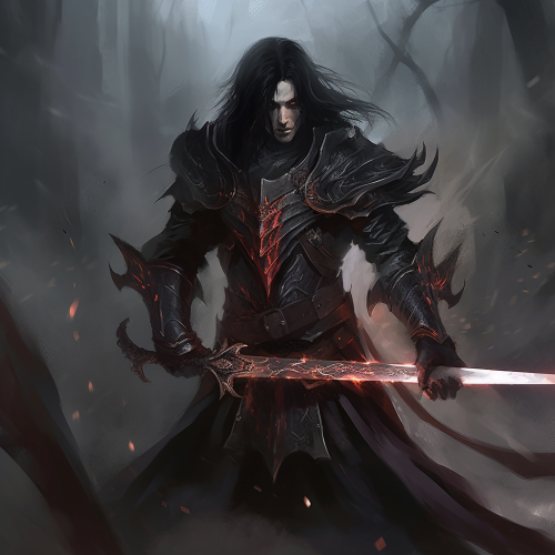 a man in black armor with long black hair, in his hand is A DEMONIC black lightning sword, dark silver, dark red, dark fantasy --v 5.0
