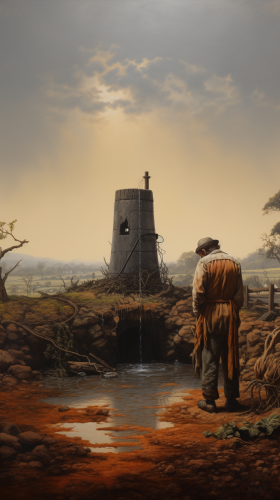 Farmer pondering next to a deep well