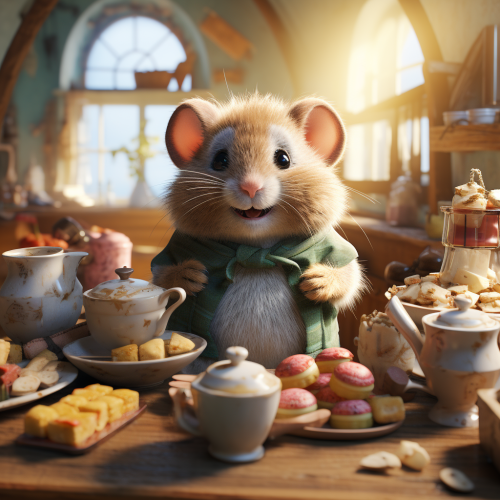 a cute chubby brown mouse, big ears, having a tea party with his tiny friends in his tiny house, funny scene, octane rendered, hyper-detailed --s 250 --style raw