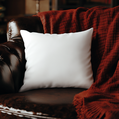 blank woven canvas white pillow on a leather couch close up, dark and moody cozy christmas style advertisement photography --ar 6:5 --personalize 9hfv3ok --v 6.1