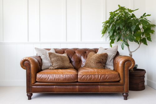 a brown leathercouch before white wall, cottage style --ar 3:2