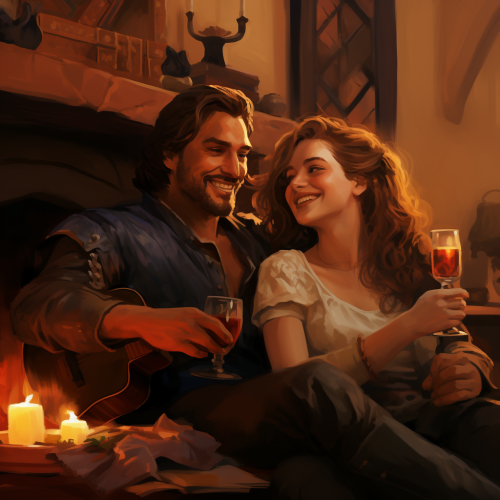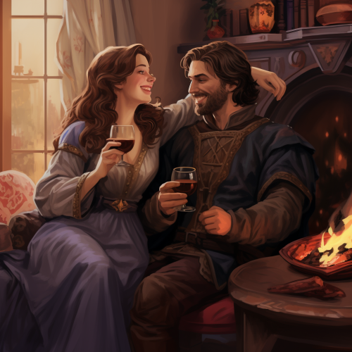 medieval era. two drunken friends are in a cozy living room on a couch in front of the fireplace. the girl is younger with golden brown hair and blue grey eyes. the muscular male has shoulder length black hair. they are sitting on a couch holding a glass of wine while they are laughing. there is a coffee table in front of the couches with a wine bottle on it.