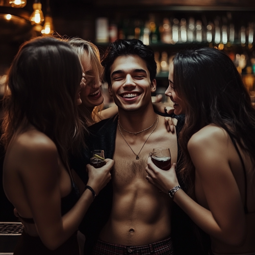A photo of a charismatic young latino man in a NYC bar being aggressively teased by 3 very flirtatious girls. The flirtatious 3 girls were all born in wealthy Long Island suburbs and are rich. They have pronounced hooked long-noses, straight dark hair. Their names are Rebecca, Rachel, Hannah, Sarah, Arielle, and Ally. Last names are Levy, Friedman, Cohen, Weinberg, Cantor, Rubin. Photorealistic, 8k --chaos 3 --v 6.1