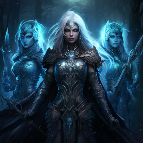 Grimdark mystic celestial squad of sky elf knights, high fantasy, digital art, masterpiece painting, ultra detailed, ultra high definition, 8K resolution, 3D, superior quality, cover illustration, complex design, deep rich vibrant colours, blue luminous highlights, hyperrealistic, meticulously hyper detailed, artstation