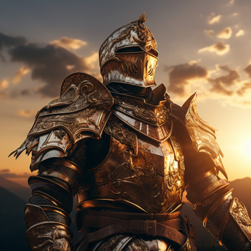 three men in plate armor stand small, silhouetted against a skyline dominated by a clockwork Machine which looks like Zone of the Enders Anubis. The setting is medieval. Dynamic lighting, extremely detailed, cinematic quality.