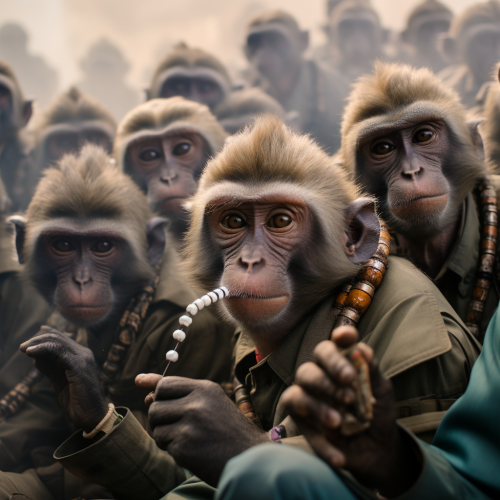 Along a forest path, 2 golden monkeys surround 1 black Bunny. Black bunny with black nose , yellow eyes, small ears, big enourmous feet, and oversized yellow shoes. so 2 golden monkeys surround the bunny. The monkeys are friendly yet mischievous, tricking Bunny into giving them carrots. Bunny looks hopeful but soon realizes he’s being deceived. The scene conveys a sense of trickery and betrayal