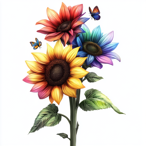 isolated on white background, high detailed illustration, Create Three beautiful realistic sunflowers in LGBTQ COLORS standing tall next to each other with little distance. The sunflowers should be in LGBTQ Rainbow Colors. The Stem of each flower should be very thin without leaf. You can add on top of each flower very less butterflys or dragonflies