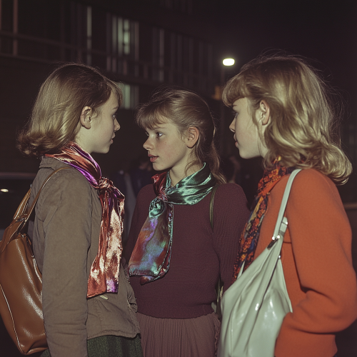 Three teenage scandinavian girls standing together outside their school at night, engaged in a casual conversation. Each girl carries a shoulder purse with a silk scarf tied to the strap, where the strap meets the bag. The scarves have reflective, iridescent colors that catch and shimmer in the dim evening light. The school building looms quietly in the background, with a few faint lights illuminating the scene. The mood is warm and friendly, capturing the bond of friendship on a quiet evening.