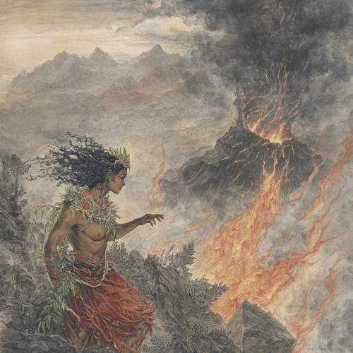 A fierce, mythical battle scene depicting Pele, the Hawaiian goddess of volcanoes and fire, confronting Lifedrinker, a towering, dark entity twice the size of the Burj Khalifa. Pele is portrayed as a powerful, radiant woman with flowing hair made of molten lava, her eyes glowing like embers. Her arms are outstretched, summoning a torrent of molten rock and volcanic fire. She stands at the mouth of an erupting volcano, with streams of lava cascading around her feet and fiery sparks flying in all directions. The ground is split open with cracks glowing red, and plumes of smoke and ash rise into the air. Lifedrinker looms above her, its dark, amorphous body swirling with a misty black void, its tendrils crackling with stolen energy. The creature’s glowing, malevolent eyes focus intently on Pele, as its tendrils reach out towards her, attempting to absorb her fiery energy. The sky is filled with a mix of dark storm clouds and fiery orange hues from the volcanic eruption, lightning bolts streaking through the scene. The atmosphere is intense, capturing the raw elemental clash between the fiery wrath of the volcano goddess and the dark, life-draining monstrosity. --sref 8282024