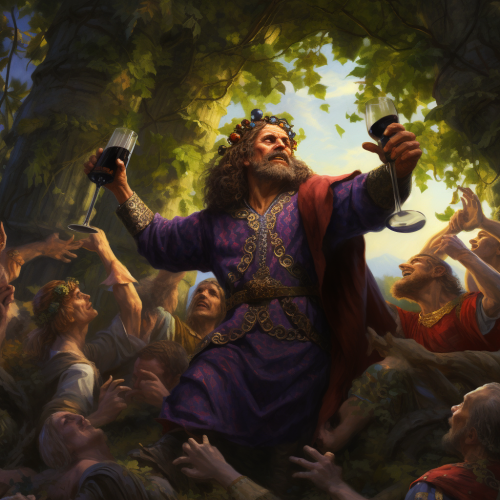 imagine the god Dionysus in his element in nature with people dancing and drinking around him