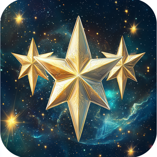 A vibrant app icon showing three radiant stars, glowing in shades of gold and white, set against a deep space-inspired background with distant stars and nebulae. The stars are positioned in a balanced formation, conveying a sense of success and reaching for the stars